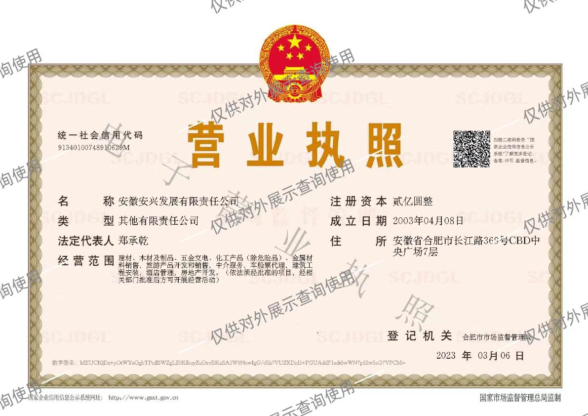 安徽安興發展有限責任公司(以下簡稱“發展公司”)是經安徽省經貿委批準,由安徽安興聯合總公司所屬安徽省安興房地產開發公司及安徽安鑫旅游有限公司重組改制,于20032月正式成立,原名“安徽安興發展股份有限公司”。